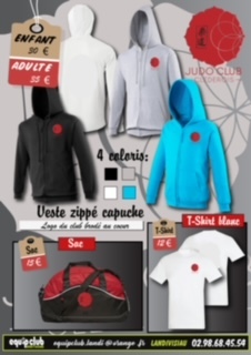 Le club vous propose des tee-shirts, sacs de sport et des sweets aux couleurs du judo club cléderois.